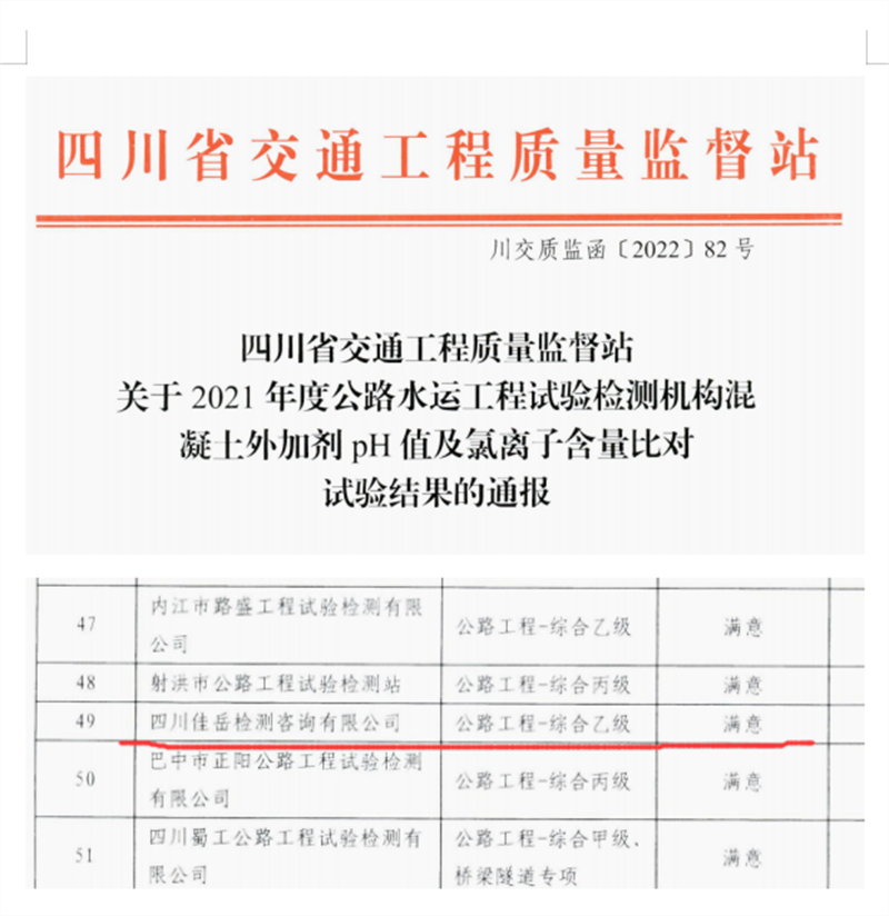 5月11日,四川省交通工程質(zhì)量監(jiān)督站印發(fā)《關(guān)于2021年度公路水運(yùn)工程試驗檢測機(jī)構(gòu)混凝土外加劑PH值及氯離子含量比對試驗結(jié)果的通報,交建集團(tuán)四川佳岳檢測咨詢有限公司獲得“滿意”評價。