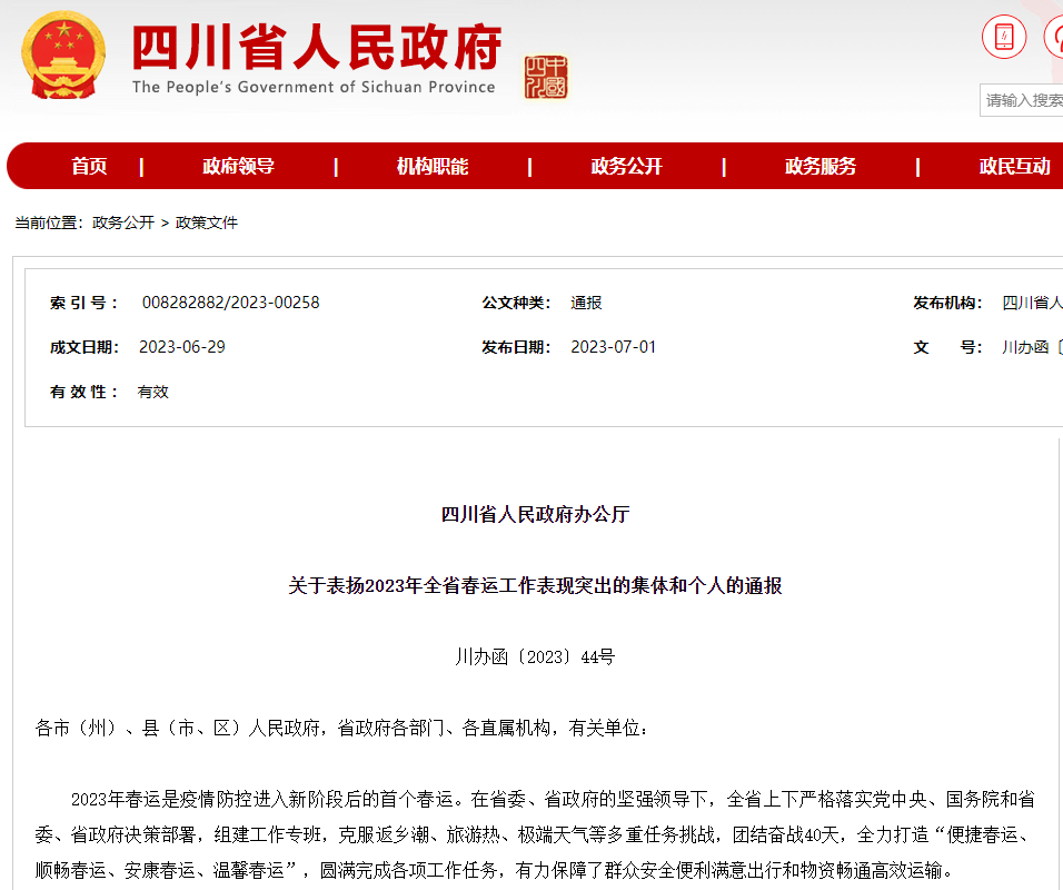 近日,四川省人民政府辦公廳印發(fā)《關(guān)于表揚2023年全省春運工作表現(xiàn)突出的集體和個人的通報》,四川蜀通運業(yè)有限公司榮獲 “2023年全省春運工作表現(xiàn)突出集體”稱號。
