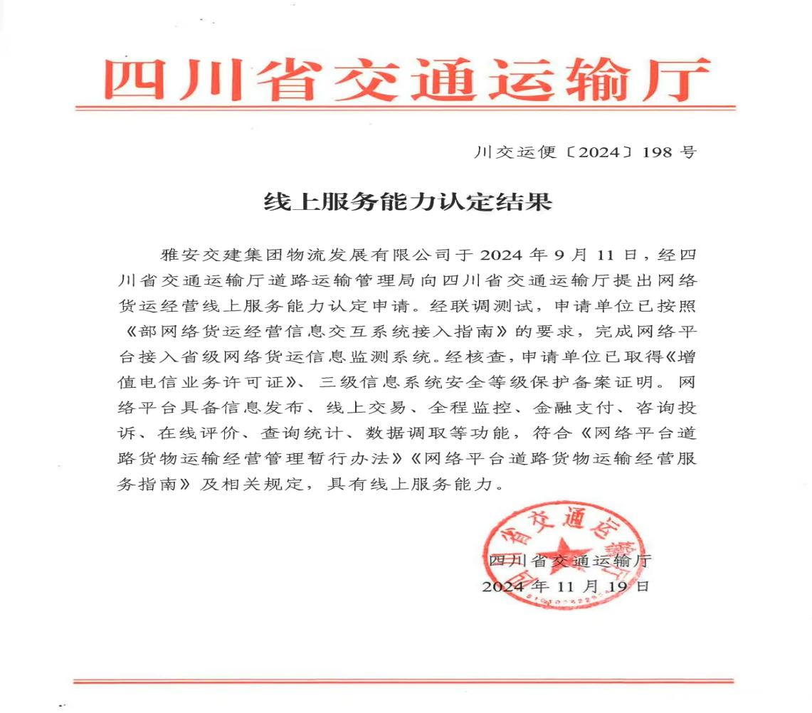 近日,《四川省交通運輸廳線上服務能力認定結果》發(fā)布,雅安交建集團物流發(fā)展有限公司正式取得網絡貨運經營線上服務能力認定,標志著雅安首家國企網絡貨運平臺即將面向市場運營。