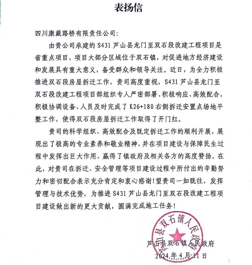近日,雅安交建集團(tuán)四川康藏路橋有限責(zé)任公司收到來(lái)自蘆山縣雙石鎮(zhèn)人民政府的表?yè)P(yáng)信。信中對(duì)S431蘆山縣龍門至雙石段改建工程項(xiàng)目部積極協(xié)調(diào)設(shè)備、人員配合當(dāng)?shù)卣瓿蒏26+180右側(cè)拆遷安置點(diǎn)場(chǎng)地平整工作,使得雙石段房屋拆遷工作取得了開門紅給予了高度評(píng)價(jià)和贊揚(yáng)。