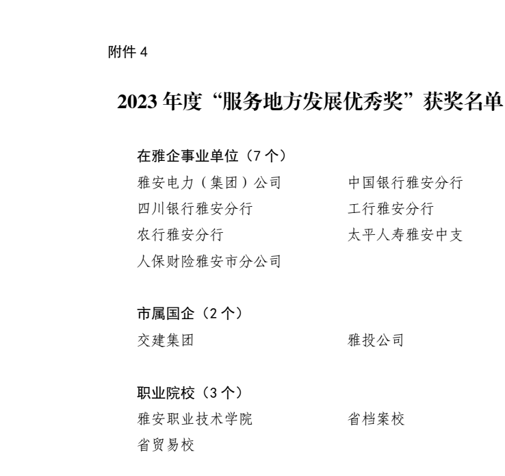 近日,中共雅安市委辦公室、雅安市人民政府辦公室印發(fā)《關(guān)于2023年度縣(區(qū))、市級部門和單列考評單位目標(biāo)績效綜合考評結(jié)果的通報》,雅安交建集團(tuán)獲得2023年度“服務(wù)地方發(fā)展優(yōu)秀獎”。