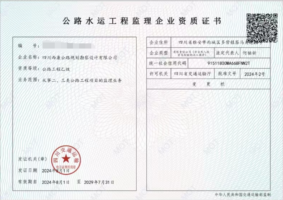 近日,經(jīng)四川省交通運(yùn)輸廳批準(zhǔn),雅安交建集團(tuán)勘察設(shè)計(jì)公司成功取得公路工程監(jiān)理乙級(jí)資質(zhì),該資質(zhì)的成功獲批,標(biāo)志著我公司業(yè)務(wù)邁向新領(lǐng)域。