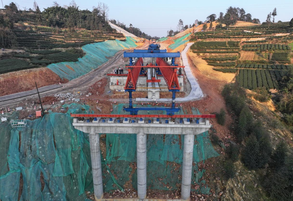 流水化施工,大力提升了架梁效率與作業(yè)安全性。截至目前,馬家溝1號橋建設(shè)取得關(guān)鍵進(jìn)展,第一跨首片梁已順利完成架設(shè)。這一突破標(biāo)志著橋梁施工正式進(jìn)入快速推進(jìn)階段,為后續(xù)馬家溝2號橋的架設(shè)及全線橋梁貫通邁出關(guān)鍵性的一步。
