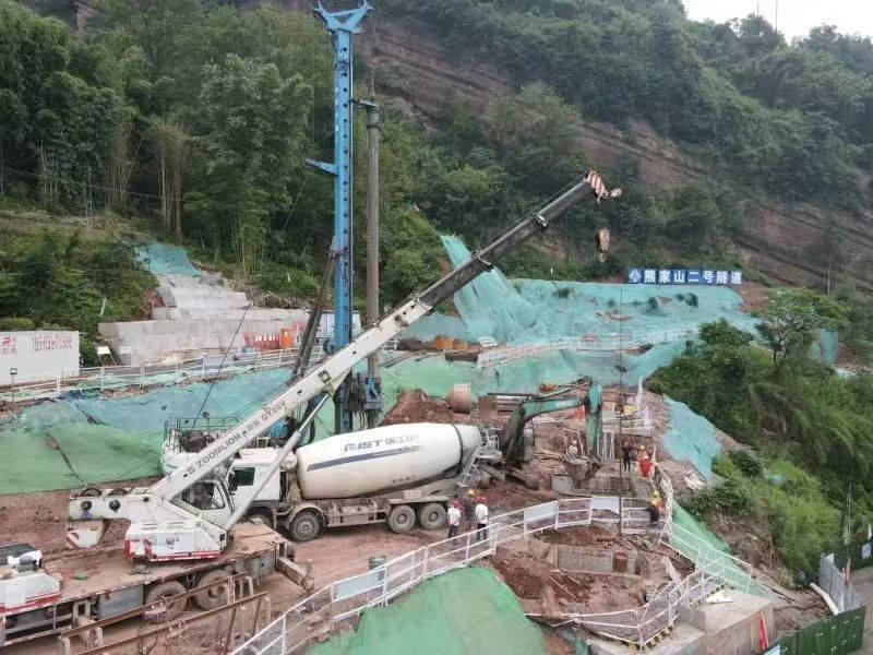“咚咚咚……”在雨城區(qū)多營鎮(zhèn)五營村熊家山二號隧道出口端空地上,旋挖鉆機開足馬力,朝著地層深處掘進,不斷發(fā)出富有節(jié)奏的聲響!懊總樁基有二十多米深。”國道318線名山區(qū)黑竹(成都界)至雨城區(qū)多營段改建工程項目副經(jīng)理林洲,每天都要到各施工點位查看進度。他說,熊家山二號隧道附近山體為順層帶,易產(chǎn)生滑坡,進洞施工前需要先在洞外打抗滑樁,以確保施工安全,目前還在開展剩下3根抗滑樁的施工。