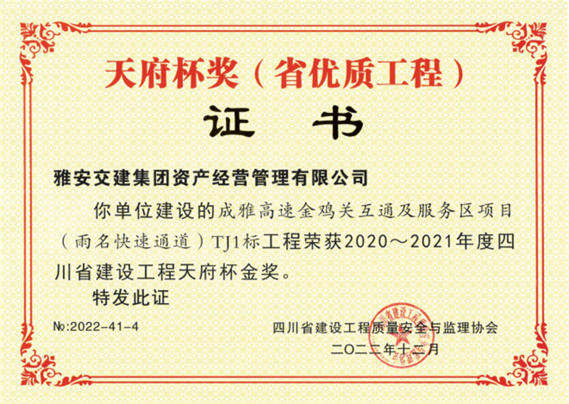 近日,雅安交建集團(tuán)資產(chǎn)經(jīng)營管理有限公司建設(shè)的成雅高速金雞關(guān)互通及服務(wù)區(qū)項(xiàng)目(雨名快速通道)TJ1標(biāo)工程榮獲2020-2021年度四川省建設(shè)工程天府杯金獎。