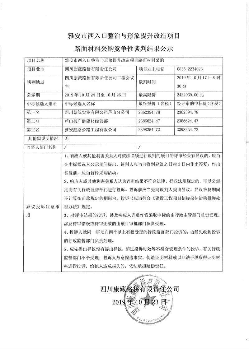 四川康藏路橋有限責(zé)任公司雅安市西入口整治與形象提升改造項(xiàng)目路面材料采購競爭性談判結(jié)果公示