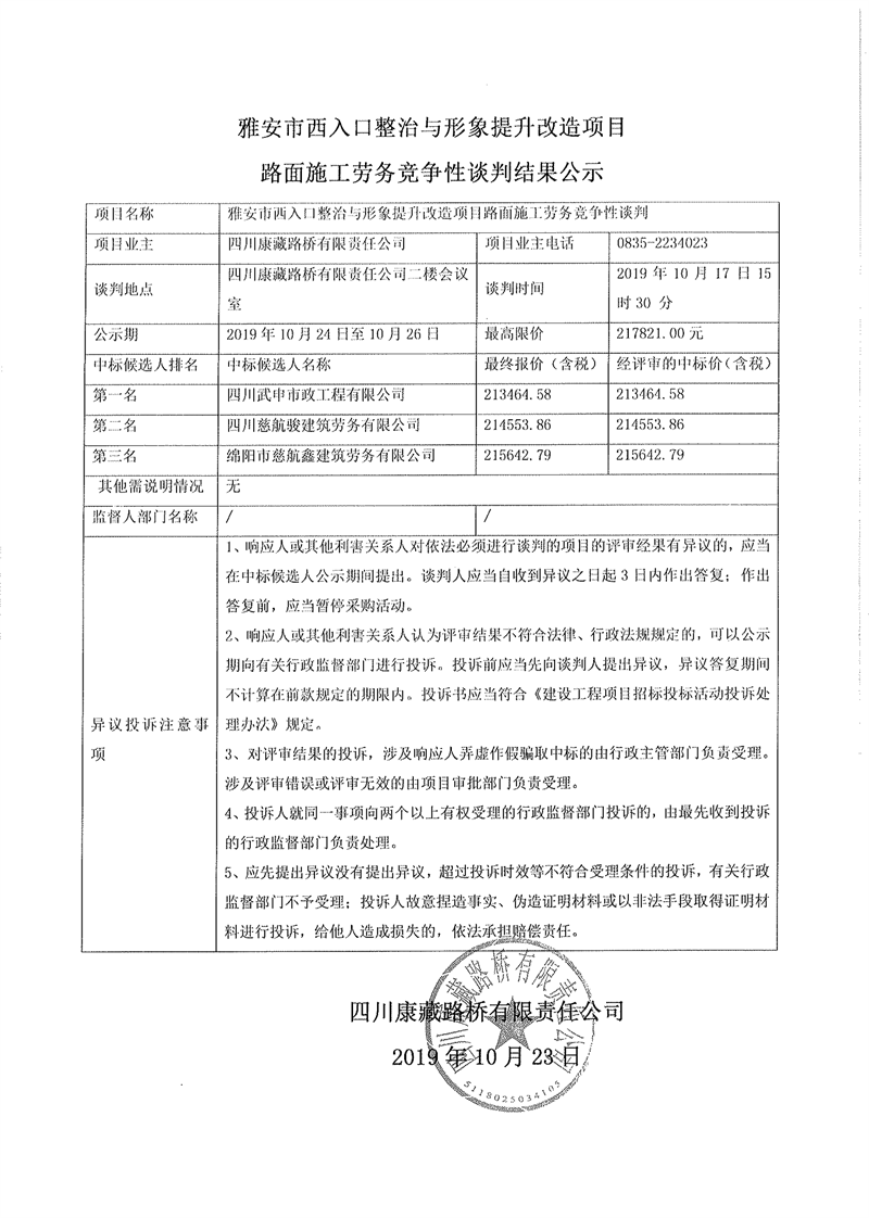 四川康藏路橋有限責(zé)任公司雅安市西入口整治與形象提升改造項(xiàng)目路面施工勞務(wù)競爭性談判結(jié)果公示