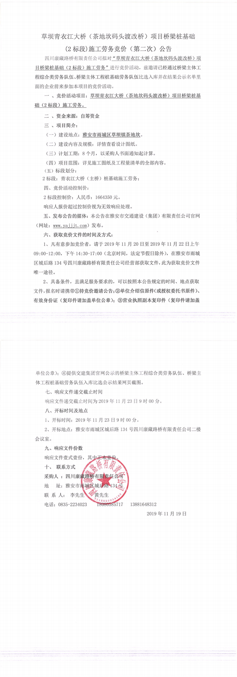 四川康藏路橋有限責任公司草壩青衣江大橋(茶地坎碼頭渡改橋)項目橋梁樁基礎(2標段)施工勞務競價(第二次)公告