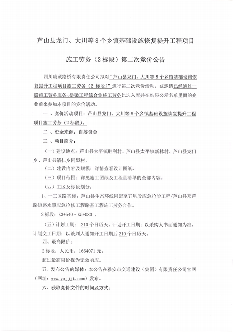 四川康藏路橋有限責任公司蘆山縣龍門、大川等8個鄉(xiāng)鎮(zhèn)基礎設施恢復提升工程項目施工勞務(2標段)第二次競價公告