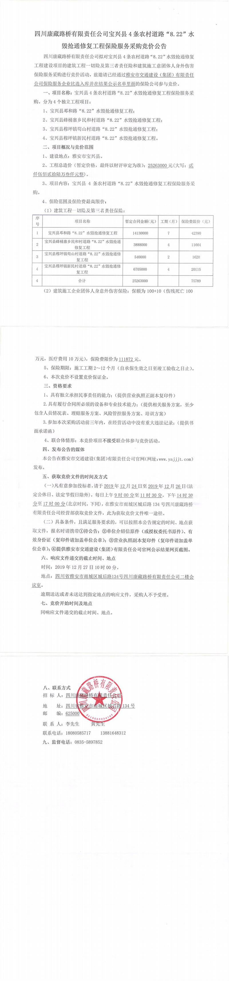 四川康藏路橋有限責任公司寶興縣4條農村道路“8.22”水毀搶通修復工程保險服務采購競價公告