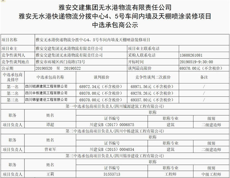 雅安無(wú)水港快遞物流分撥中心4、5號(hào)車間內(nèi)墻及天棚噴涂裝修項(xiàng)目中選承包商公示