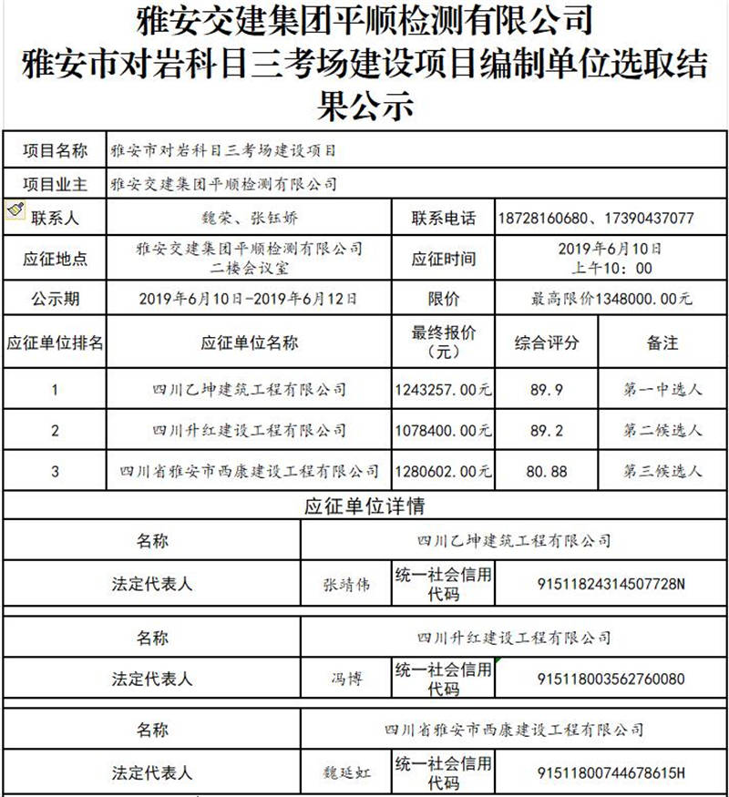 雅安交建集團平順檢測有限公司雅安市對巖科目三考場建設項目編制單位選取結果公示