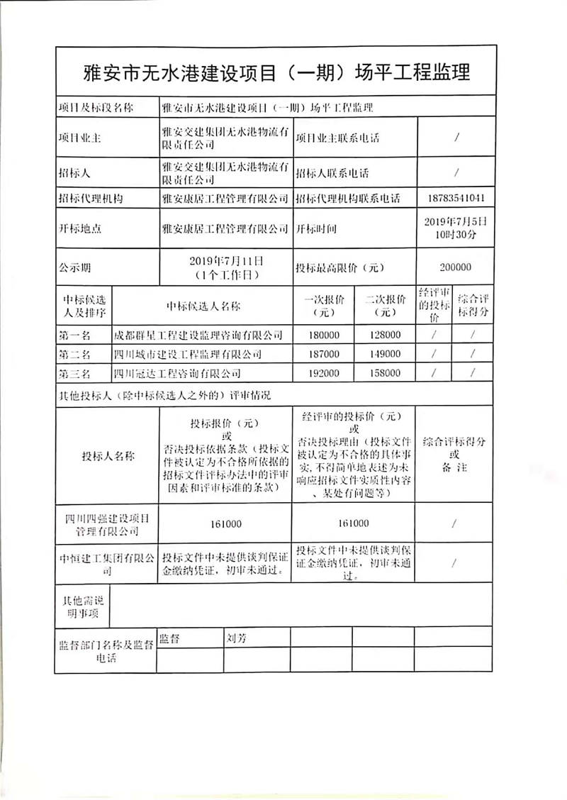 雅安交建集團無水港物流有限責任公司雅安市無水港建設(shè)項目(一期)場平工程監(jiān)理競爭性談判結(jié)果公示