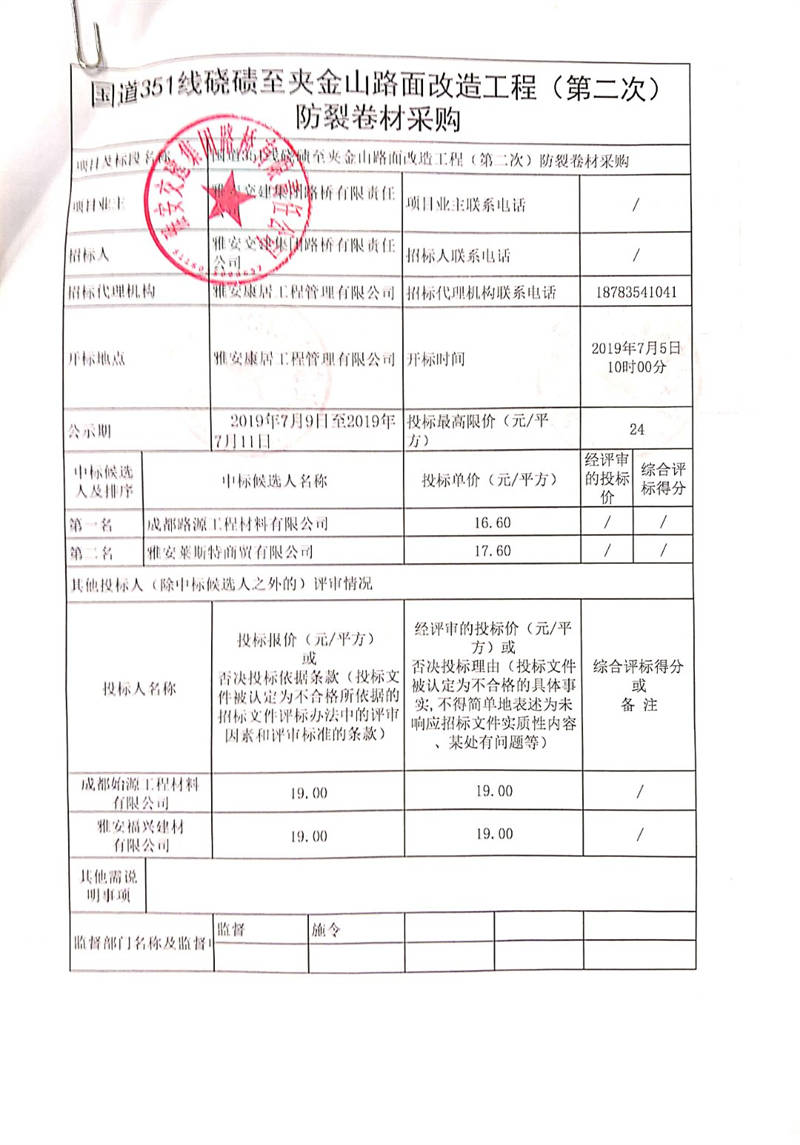 雅安交建集團(tuán)路橋有限責(zé)任公司國道351線磽磧至夾金山路面改造工程(第二次)防裂卷材采購競爭性談判結(jié)果公示