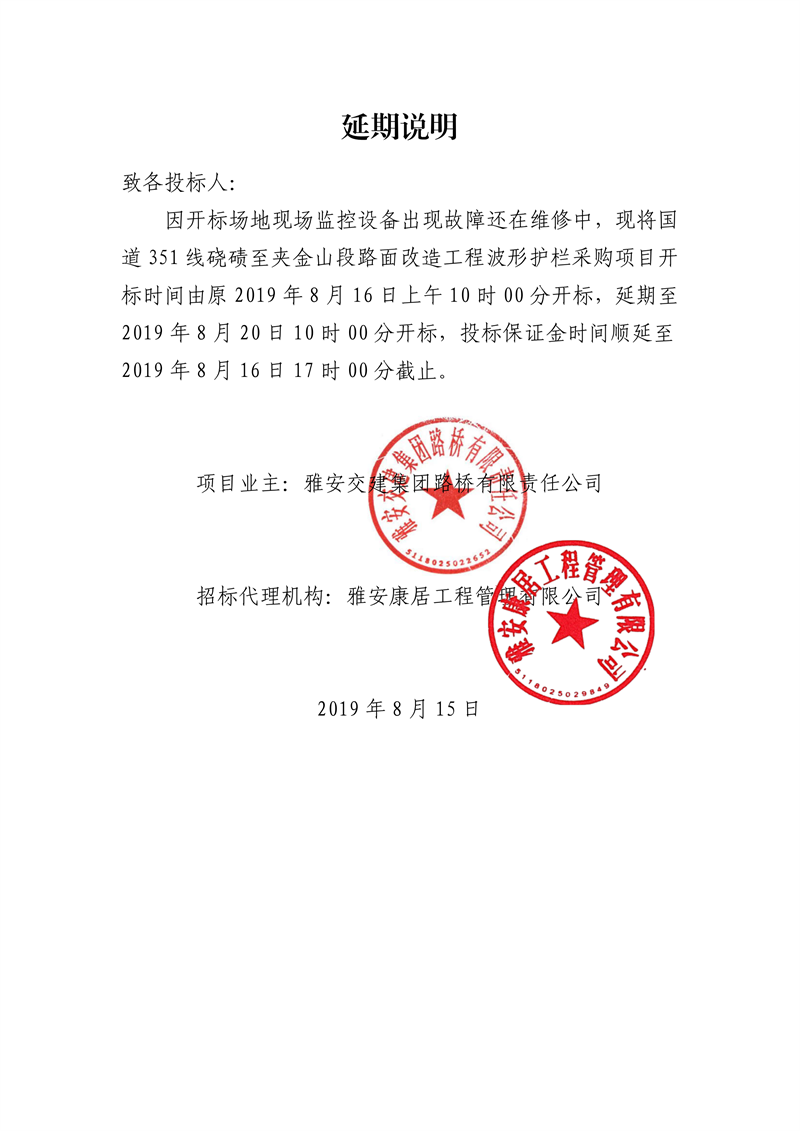 雅安交建集團(tuán)路橋有限責(zé)任公司國(guó)道351線磽磧至夾金山段路面改造工程波形護(hù)欄采購延期說明