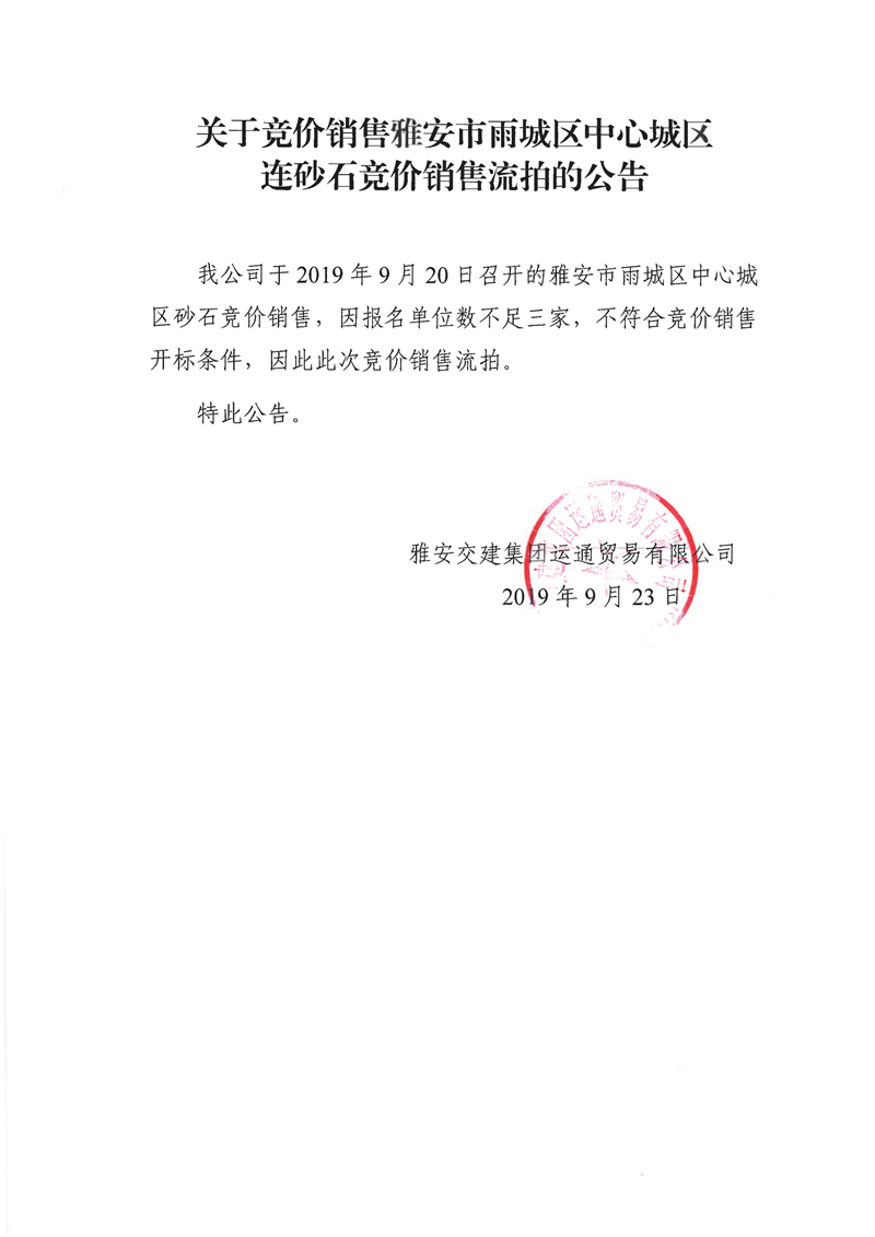 雅安交建集團運通貿易有限公司關于競價銷售雅安市雨城區(qū)中心城區(qū)連砂石競價銷售流拍的公告