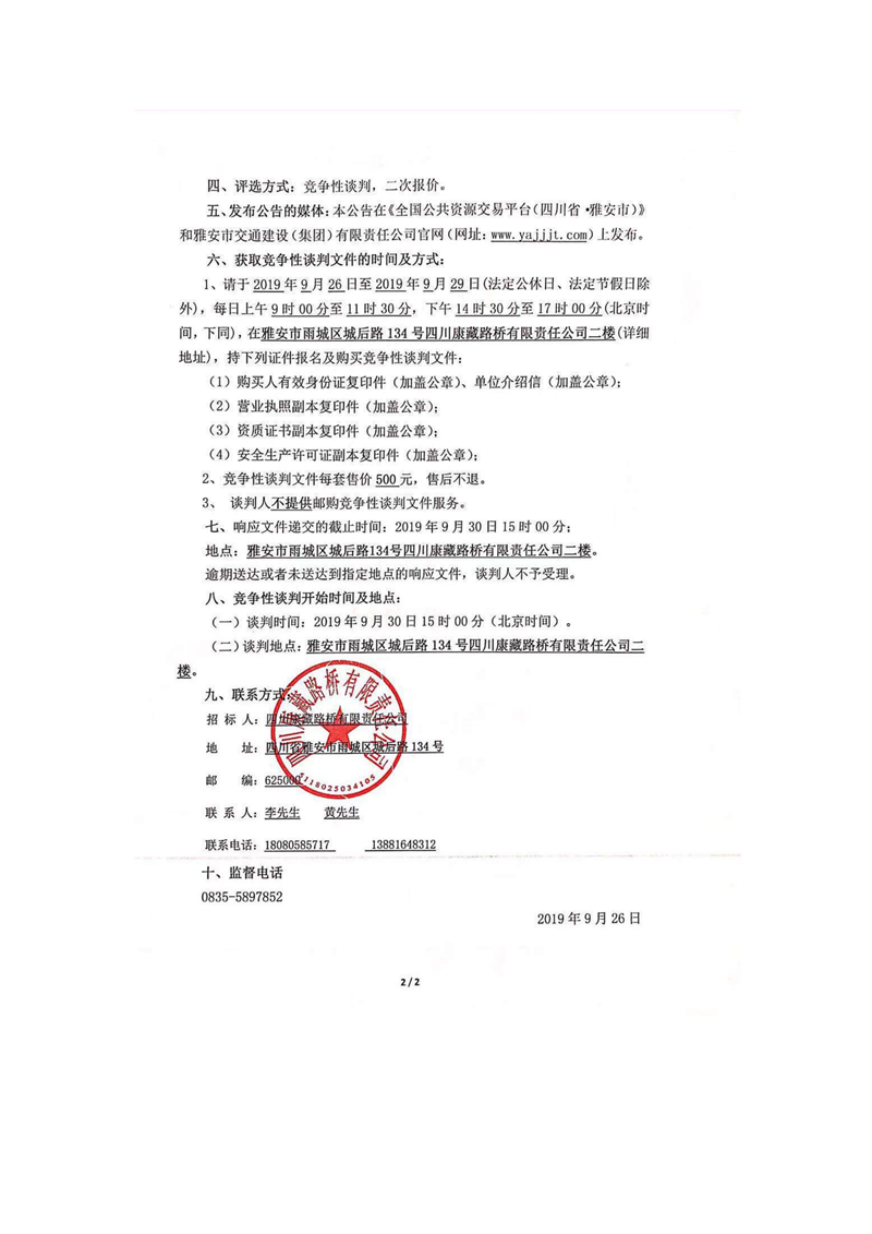 四川康藏路橋有限責(zé)任公司國道351線磽磧至夾金山段路面改造工程波形護(hù)欄采購競(jìng)爭(zhēng)性談判公告