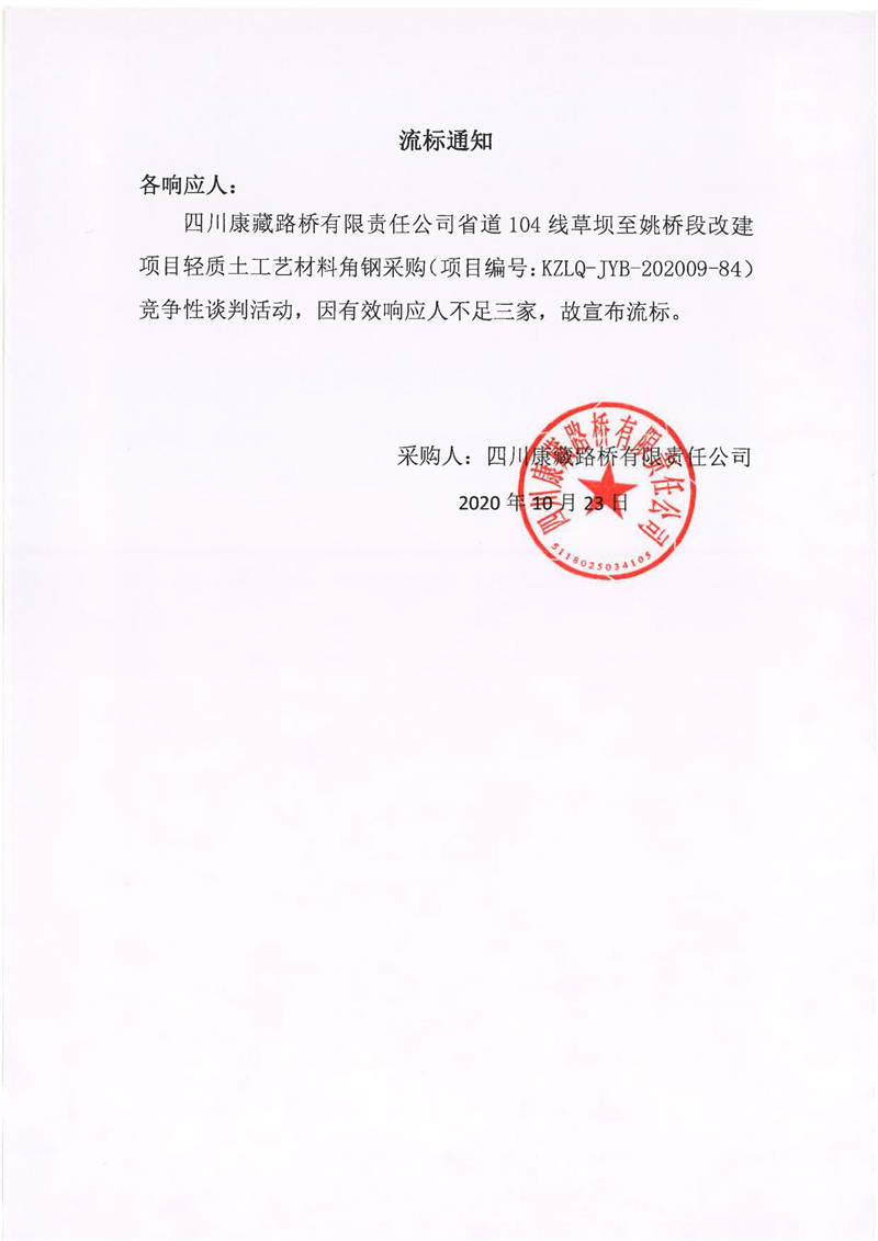 四川康藏路橋有限責(zé)任公司省道104線草壩至姚橋段改建項(xiàng)目輕質(zhì)土工藝材角鋼采購項(xiàng)目流標(biāo)通知
