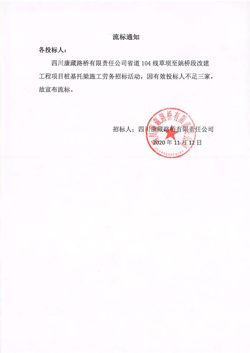 四川康藏路橋有限責(zé)任公司省道104線(xiàn)草壩至姚橋段改建工程項(xiàng)目樁基托梁施工勞務(wù)流標(biāo)通知