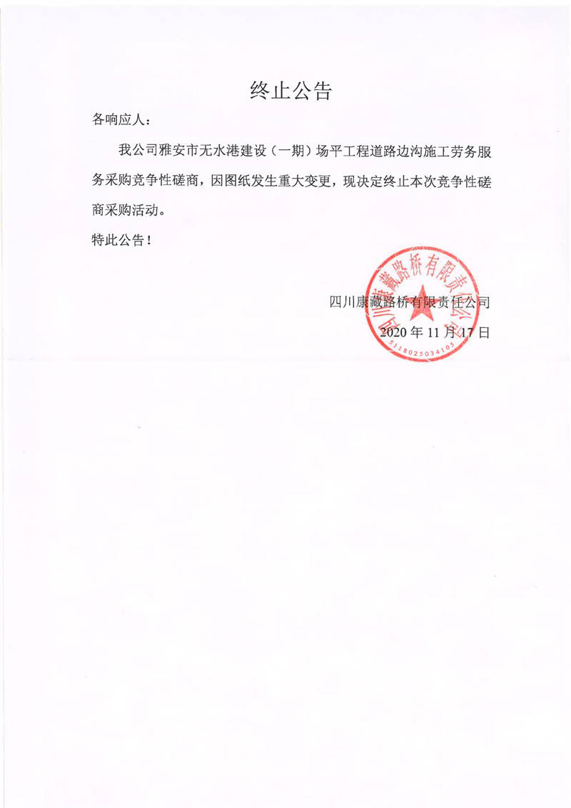 四川康藏路橋有限責(zé)任公司雅安市無(wú)水港建設(shè)(一期)場(chǎng)平工程道路邊溝施工勞務(wù)服務(wù)采購(gòu)終止公告