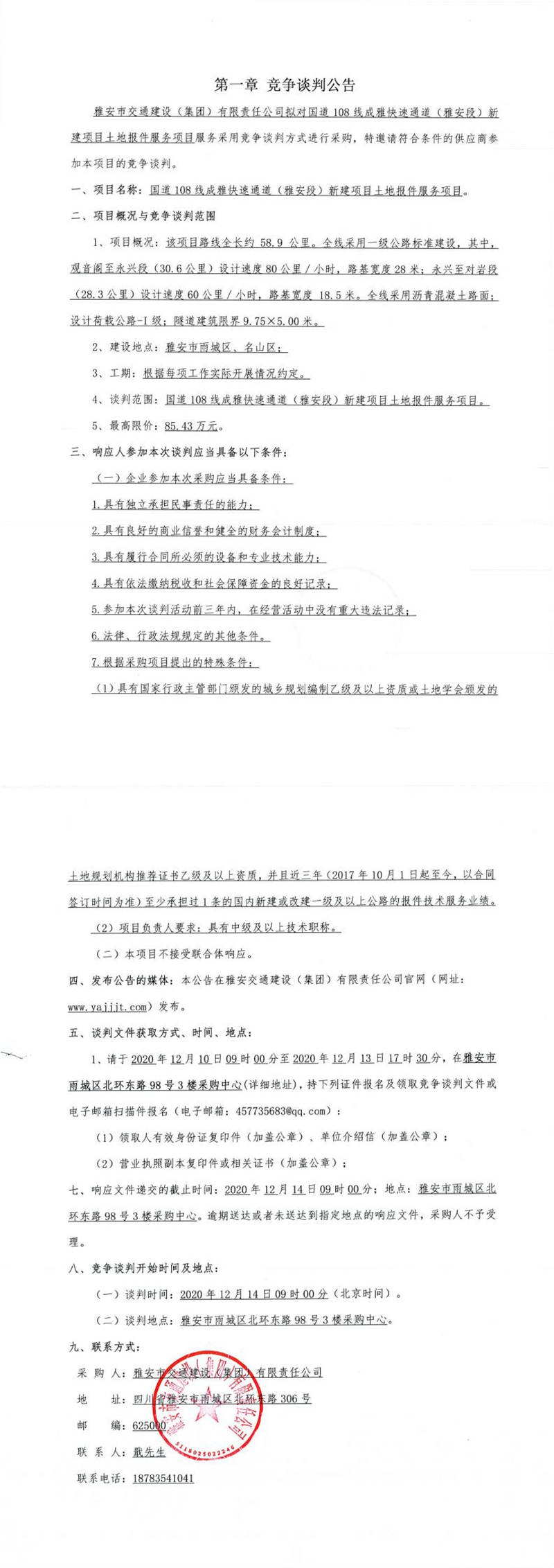 雅安市交通建設(shè)(集團(tuán))有限責(zé)任公司國道108線成雅快速通道(雅安段)新建項目土地報件服務(wù)項目競爭談判公告