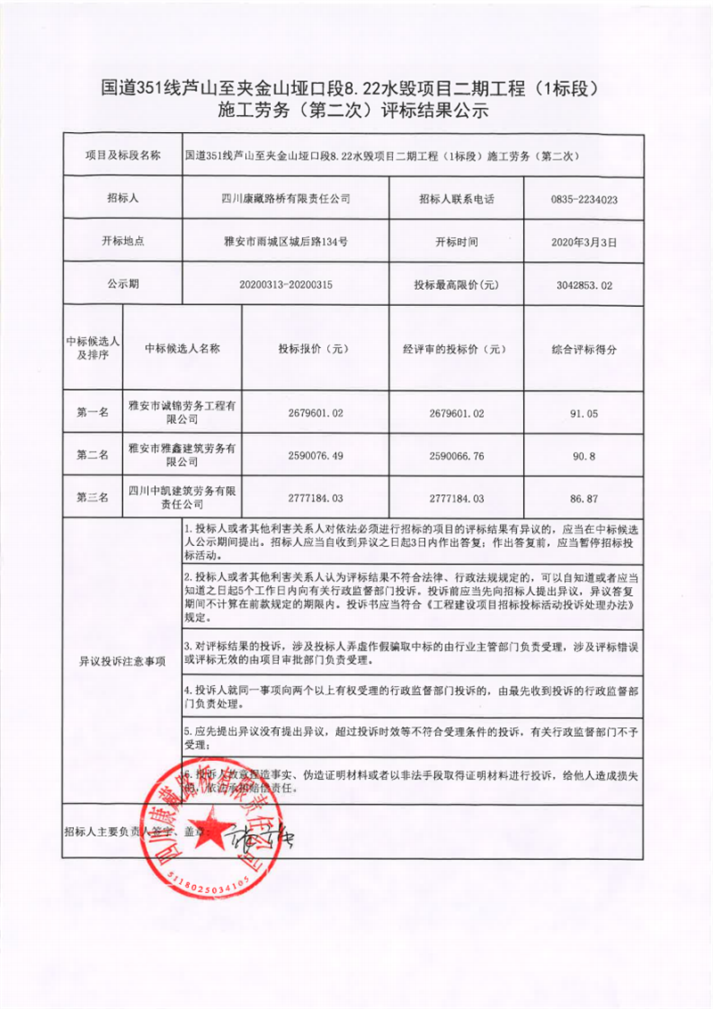 四川康藏路橋有限責任公司國道351線蘆山至夾金山埡口段8.22水毀項目二期工程(1標段)施工勞務(第二次)評標結果公示