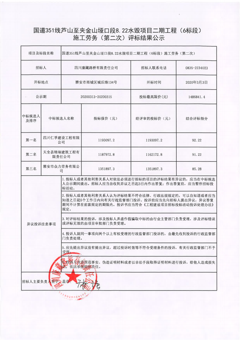 四川康藏路橋有限責任公司國道351線蘆山至夾金山埡口段8.22水毀項目二期工程(6標段)施工勞務(第二次)評標結果公示