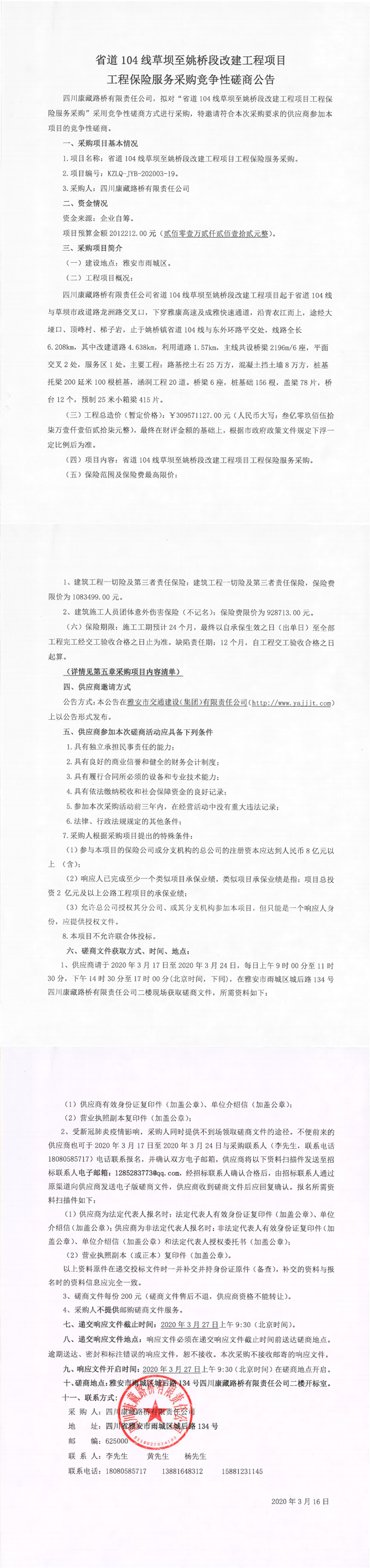 四川康藏路橋有限責(zé)任公司省道104線草壩至姚橋段改建工程項(xiàng)目工程保險(xiǎn)服務(wù)采購競爭性磋商公告