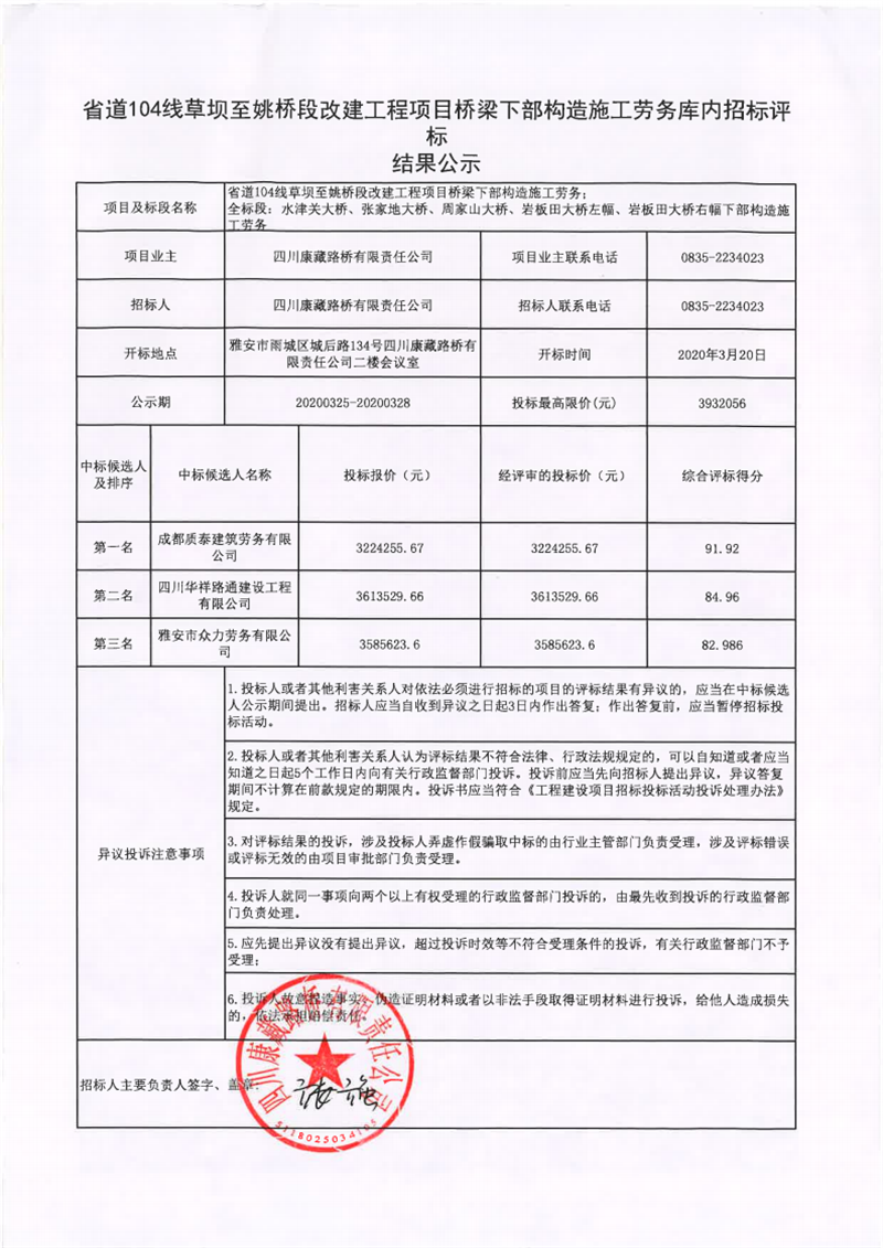 四川康藏路橋有限責任公司省道104線草壩至姚橋段改建工程項目橋梁下部構造施工勞務評標結果公示