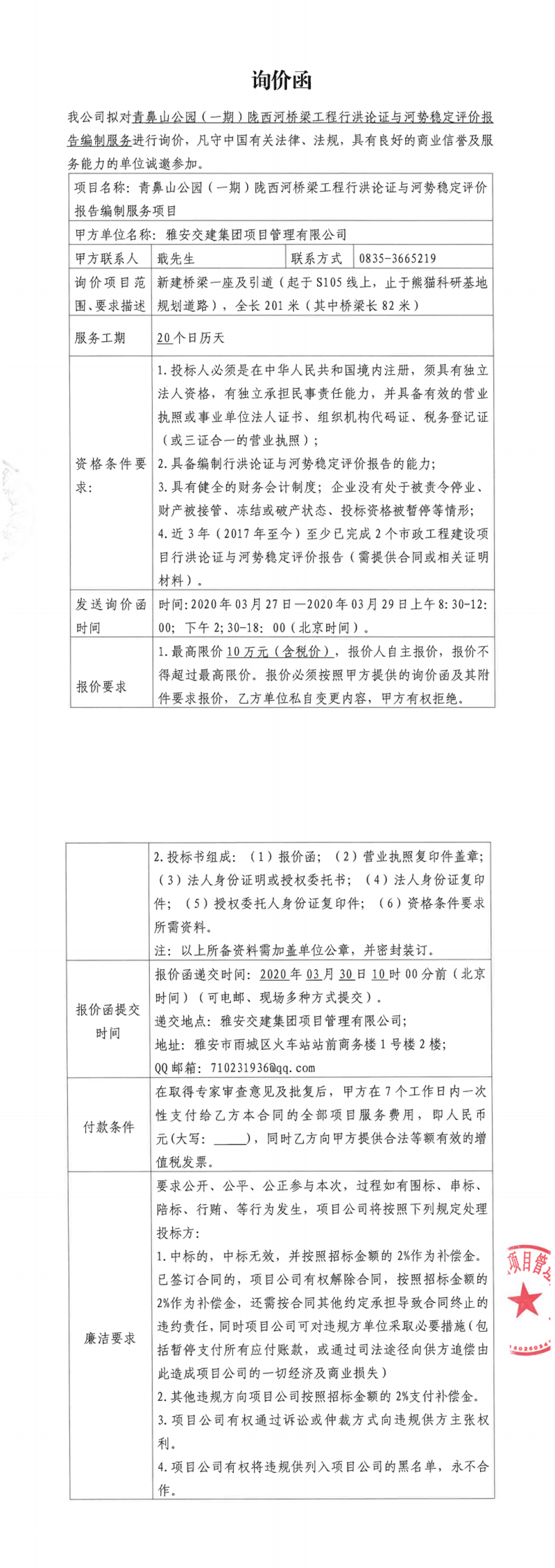 雅安交建集團(tuán)項(xiàng)目管理有限公司青鼻山公園(一期)隴西河橋梁工程行洪論證及河勢穩(wěn)定評價(jià)報(bào)告編制服務(wù)項(xiàng)目詢價(jià)函