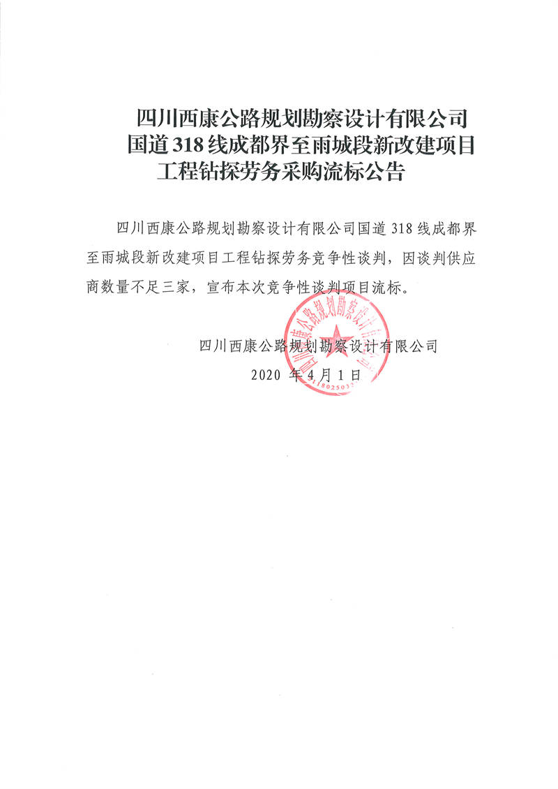 四川西康公路規(guī)劃勘察設(shè)計有限公司國道318線成都界至雨城段新改建項(xiàng)目工程鉆探勞務(wù)采購流標(biāo)公告