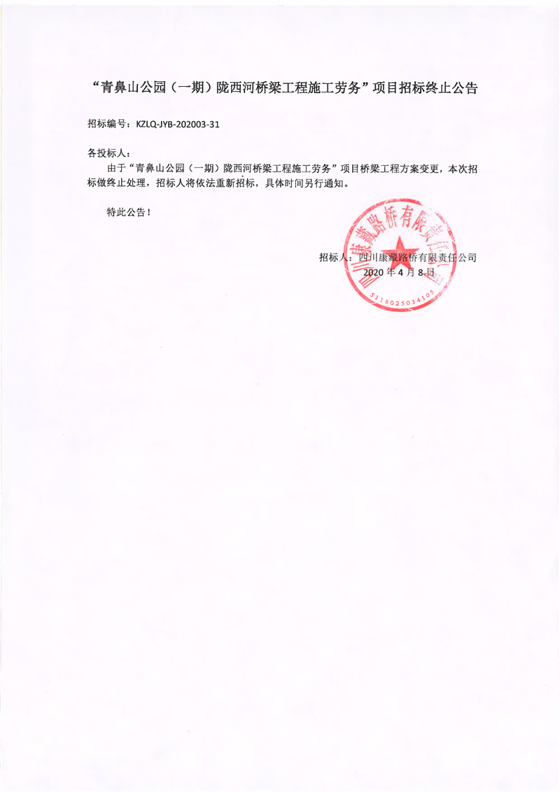 四川康藏路橋有限責(zé)任公司青鼻山公園(一期)隴西河橋梁工程施工勞務(wù)項(xiàng)目招標(biāo)終止公告