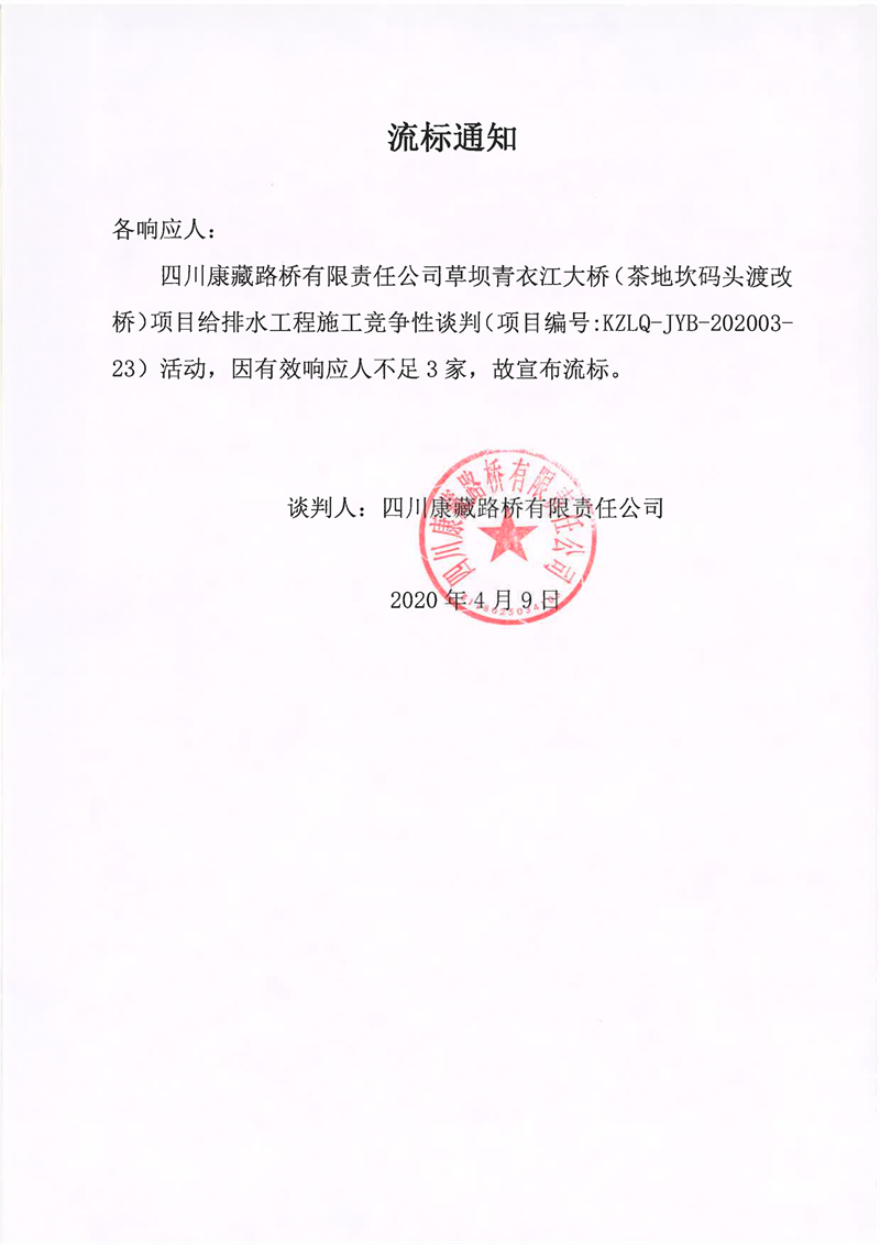 四川康藏路橋有限責(zé)任公司草壩青衣江大橋(茶地坎碼頭渡改橋)項(xiàng)目給排水工程施工競爭性談判流標(biāo)通知