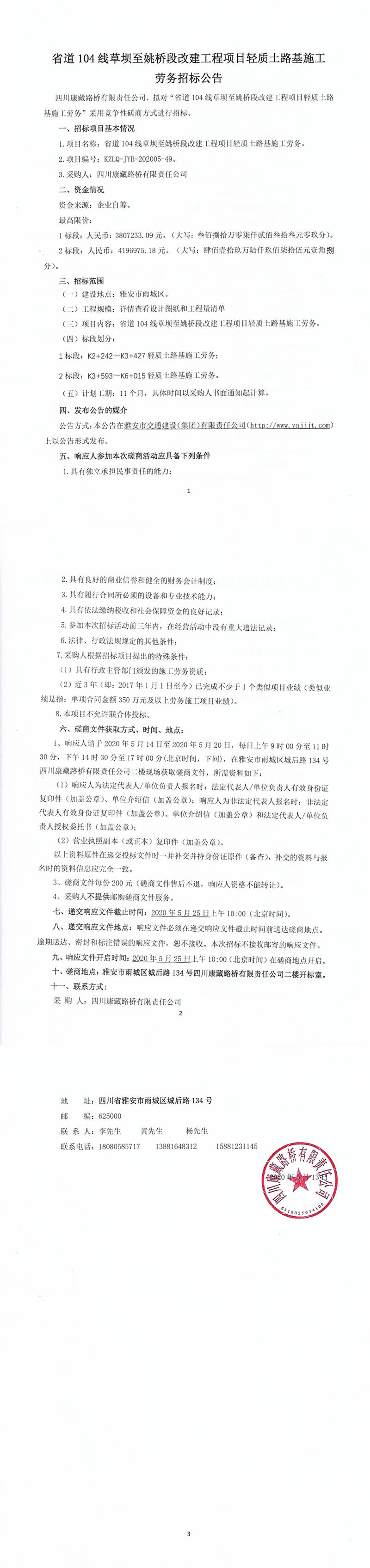 四川康藏路橋有限責(zé)任公司省道104線草壩至姚橋段改建項(xiàng)目輕質(zhì)土路基施工勞務(wù)招標(biāo)公告