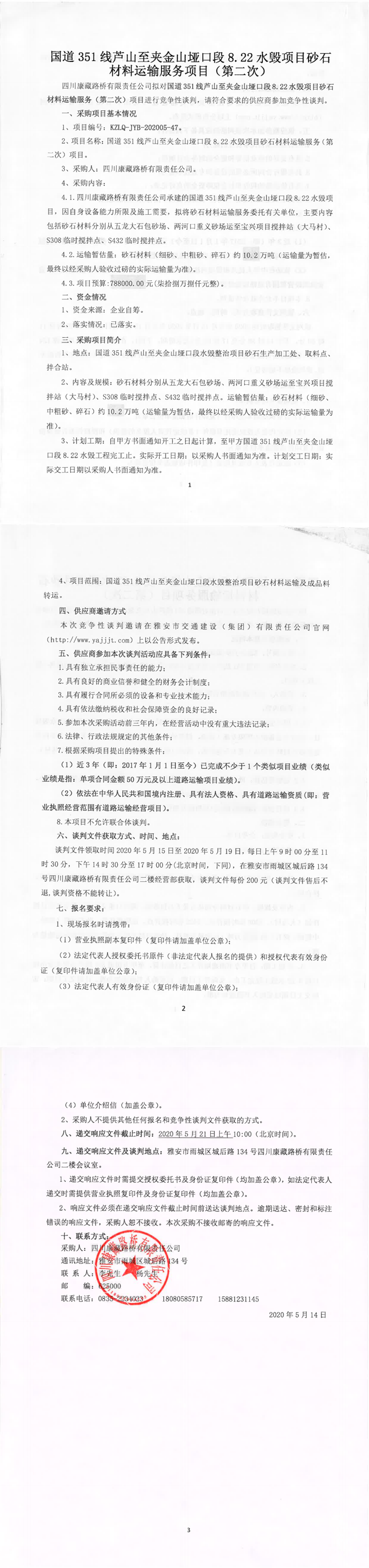 四川康藏路橋有限責任公司國道351線蘆山至夾金山埡口段8.22水毀項目砂石材料運輸服務(wù)項目(第二次)競爭性談判公告