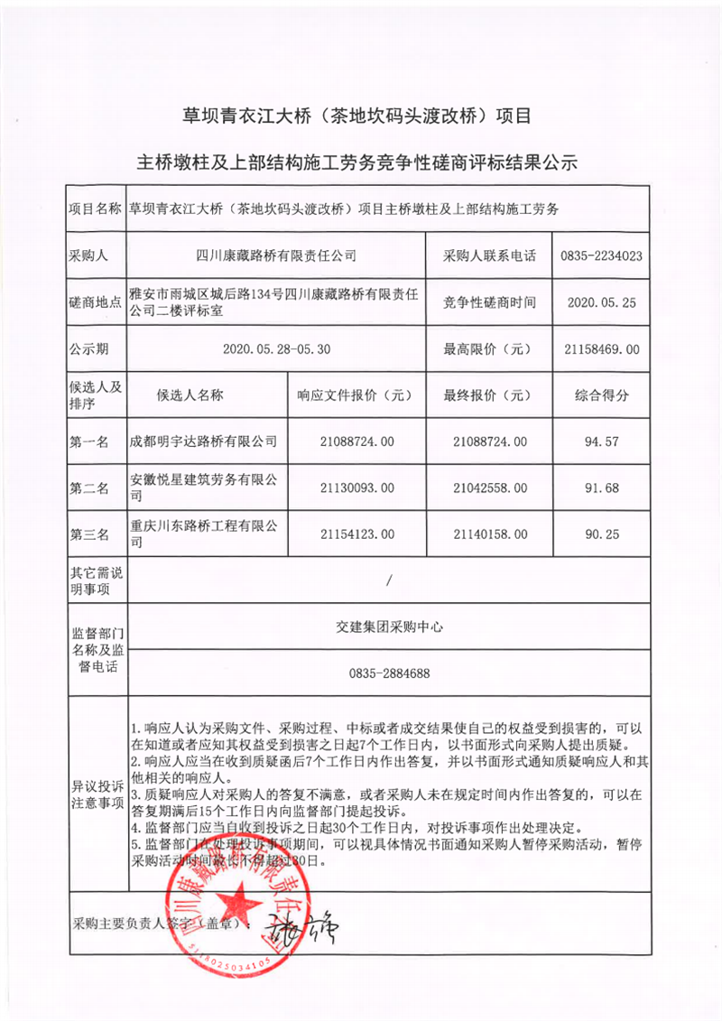 四川康藏路橋有限責(zé)任公司草壩青衣江大橋(茶地坎碼頭渡改橋)項目主橋墩柱及上部結(jié)構(gòu)施工勞務(wù)競爭性磋商評標結(jié)果公示