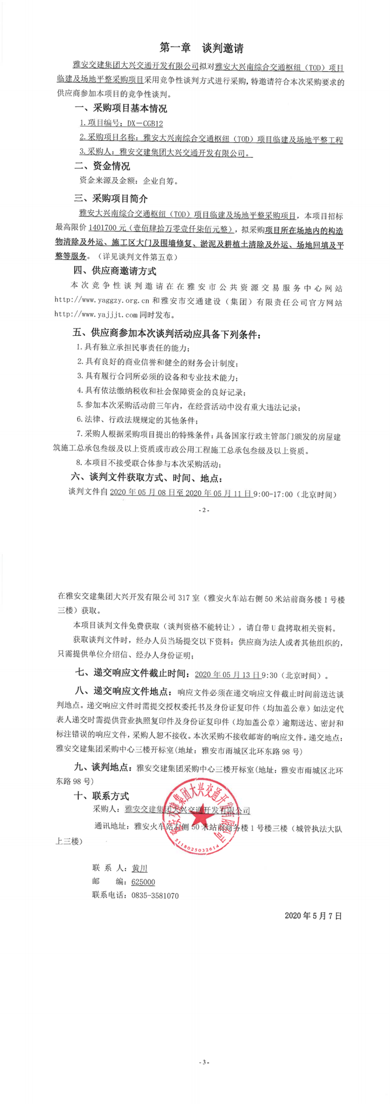 雅安交建集團(tuán)大興交通開(kāi)發(fā)有限公司雅安大興南綜合交通樞紐(TOD)項(xiàng)目臨建及場(chǎng)地平整工程競(jìng)爭(zhēng)性談判公告