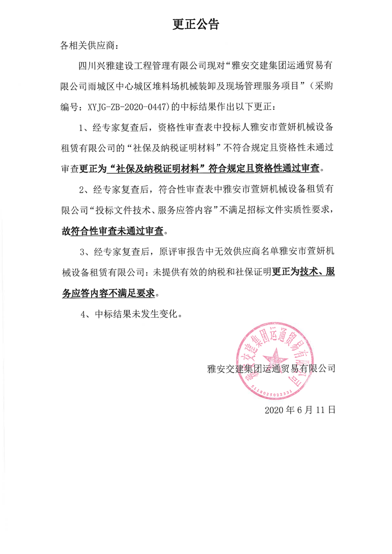 雅安交建集團(tuán)運(yùn)通貿(mào)易有限公司雨城區(qū)中心城區(qū)堆料場機(jī)械裝卸及現(xiàn)場管理服務(wù)項(xiàng)目更正公告