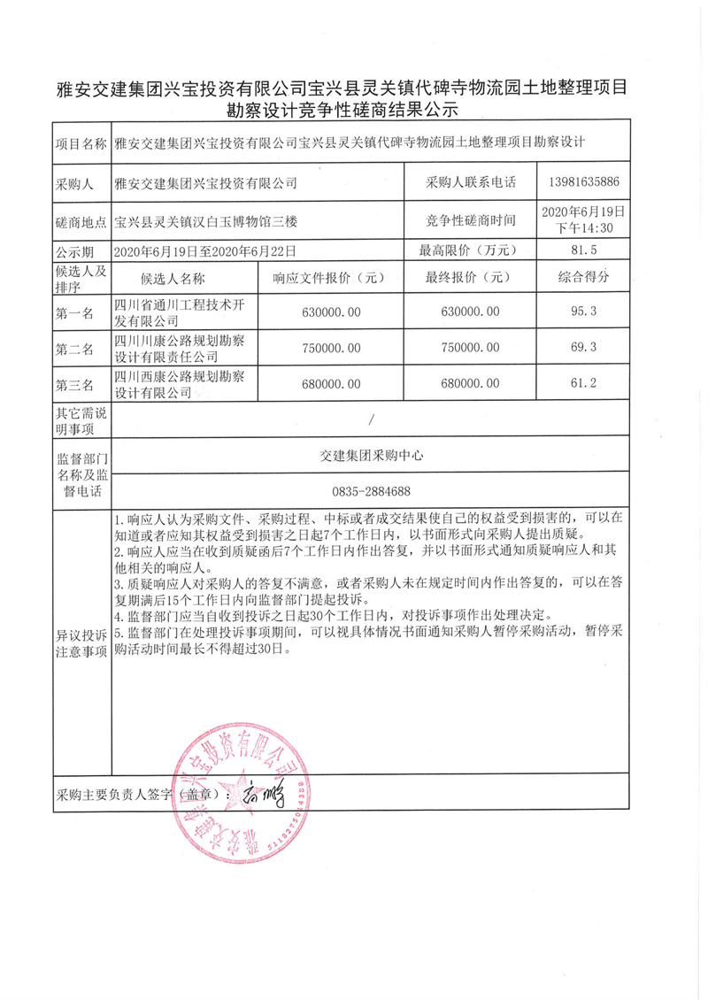 雅安交建集團(tuán)興寶投資有限公司寶興縣靈關(guān)鎮(zhèn)代碑寺物流園土地整理項(xiàng)目勘察設(shè)計(jì)競爭性磋商結(jié)果公示