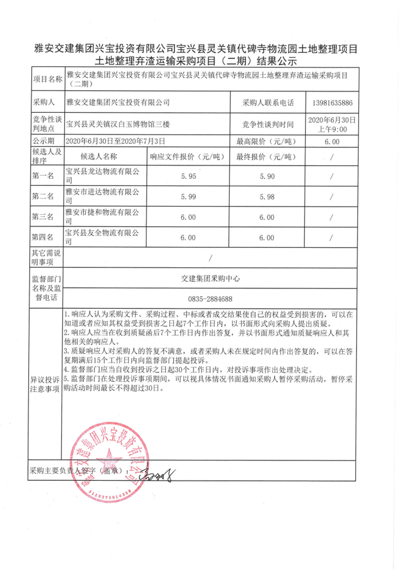 雅安交建集團興寶投資有限公司寶興縣靈關鎮(zhèn)代碑寺物流園土地整理項目土地整理棄渣運輸采購項目(二期)結(jié)果公示