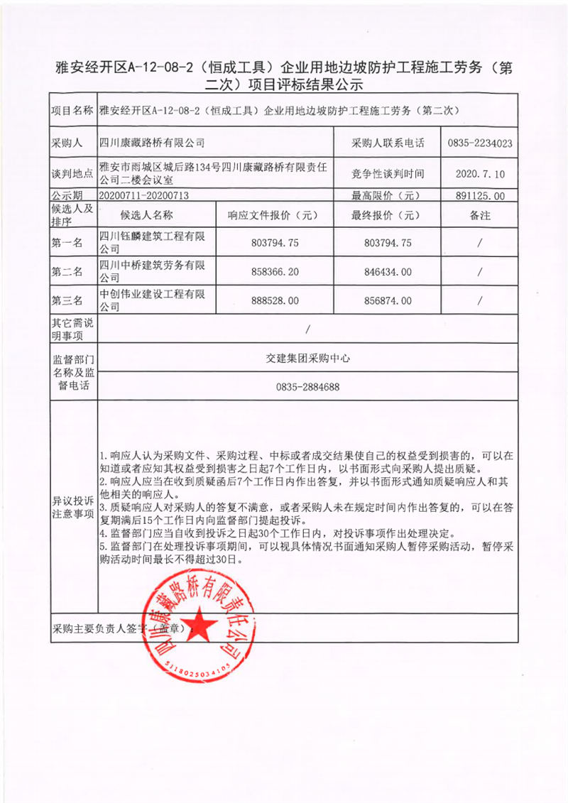 四川康藏路橋有限公司雅安經(jīng)開區(qū)A-12-08-2(恒成工具)企業(yè)用地邊坡防護工程施工勞務(wù)(第二次)項目評標(biāo)結(jié)果公示