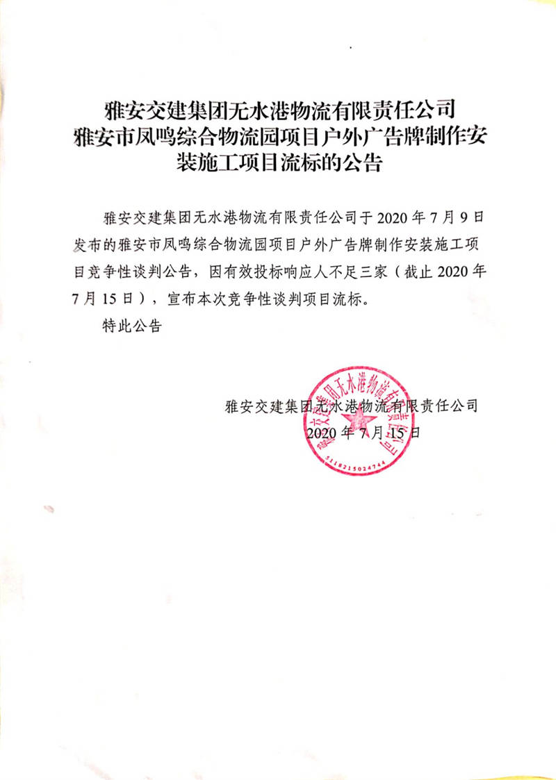 雅安交建集團無水港物流有限責任公司雅安市鳳鳴綜合物流園項目戶外廣告牌制作安裝施工項目流標公告