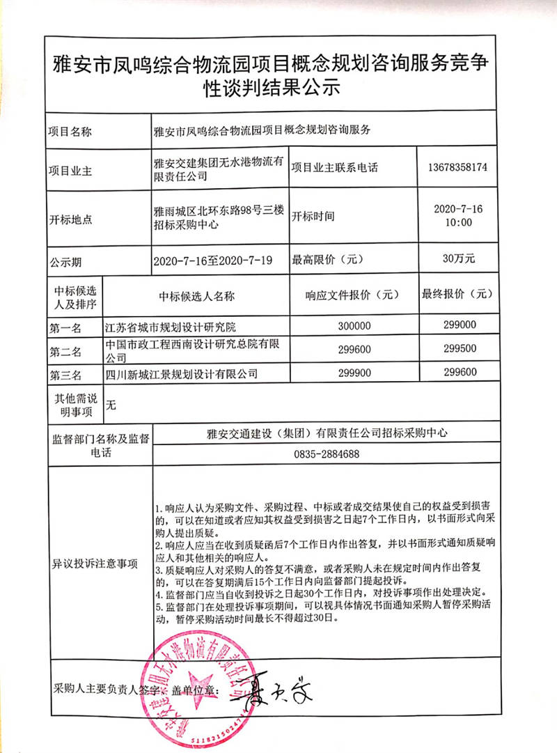 雅安交建集團(tuán)無(wú)水港物流有限責(zé)任公司雅安市鳳鳴綜合物流園項(xiàng)目概念規(guī)劃咨詢(xún)服務(wù)競(jìng)爭(zhēng)性談判結(jié)果公示