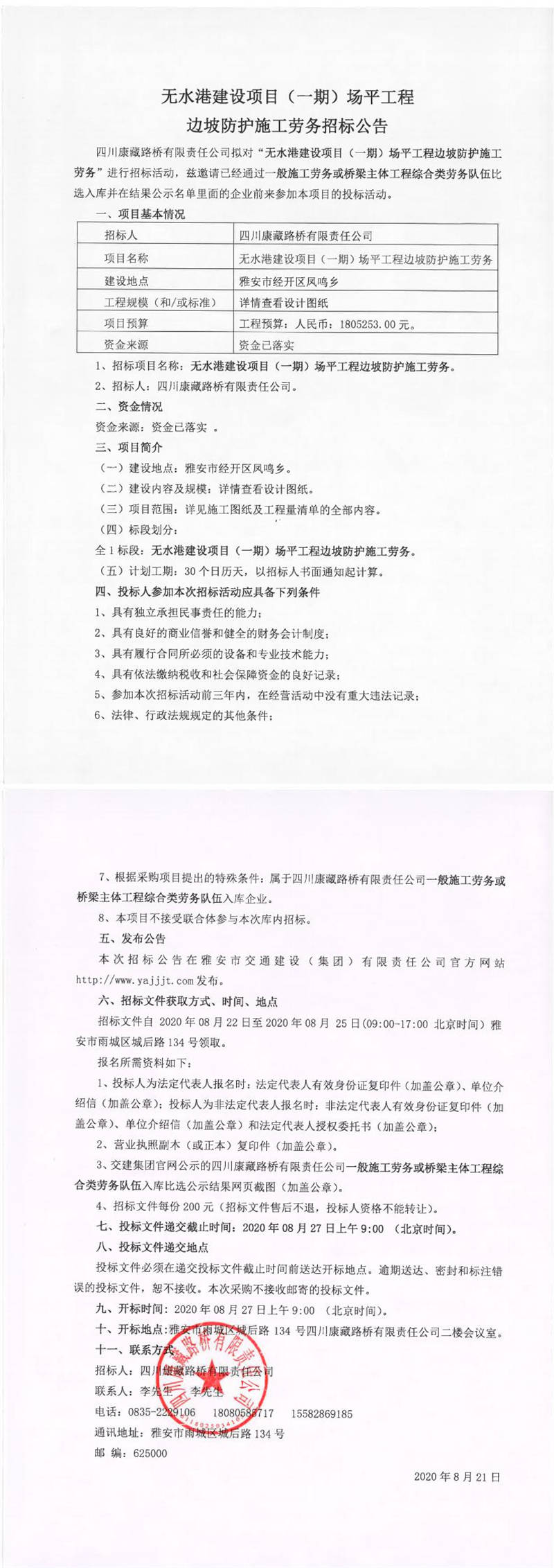 四川康藏路橋有限責任公司無水港建設(shè)項目(一期)場平工程邊坡防護施工勞務(wù)招標公告