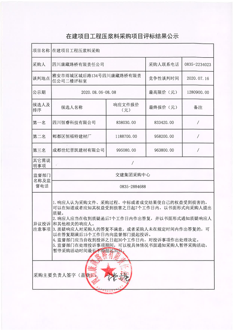 四川康藏路橋有限責任公司在建項目工程壓漿料采購評標結(jié)果公示
