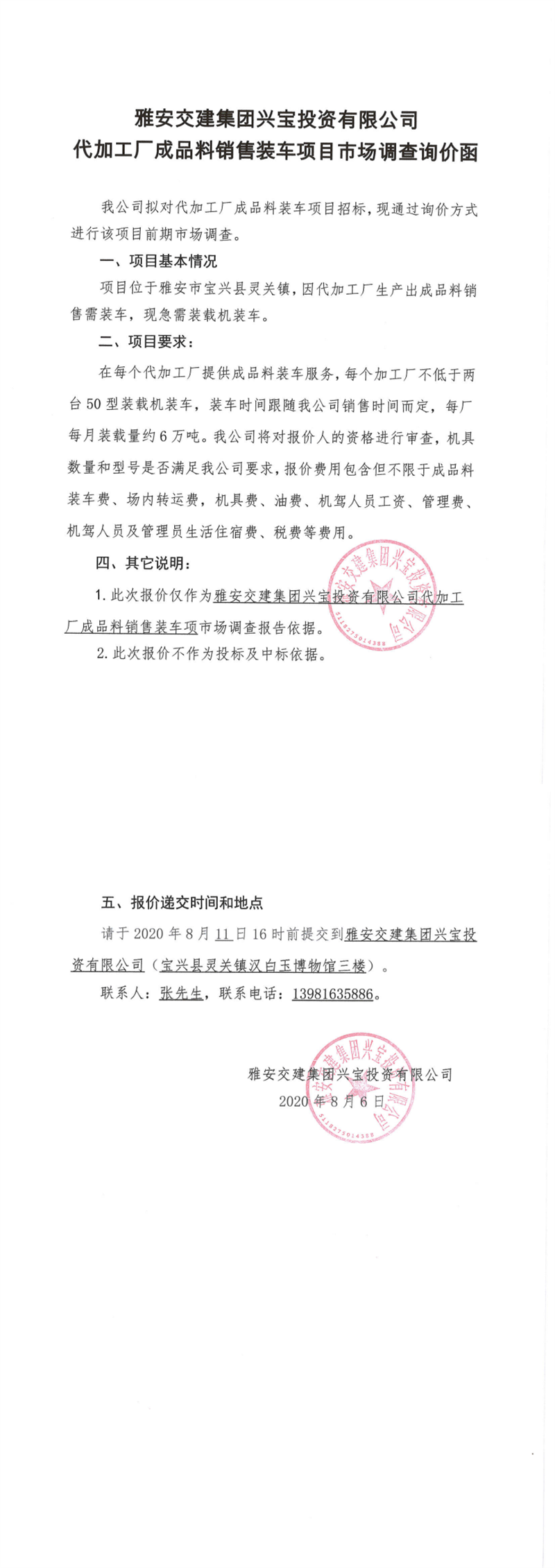 雅安交建集團(tuán)興寶投資有限公司代加工成品料銷售裝車項(xiàng)目市場調(diào)查詢價函