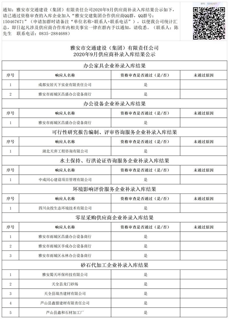 雅安市交通建設(集團)有限責任公司2020年9月供應商補錄入庫結果公示