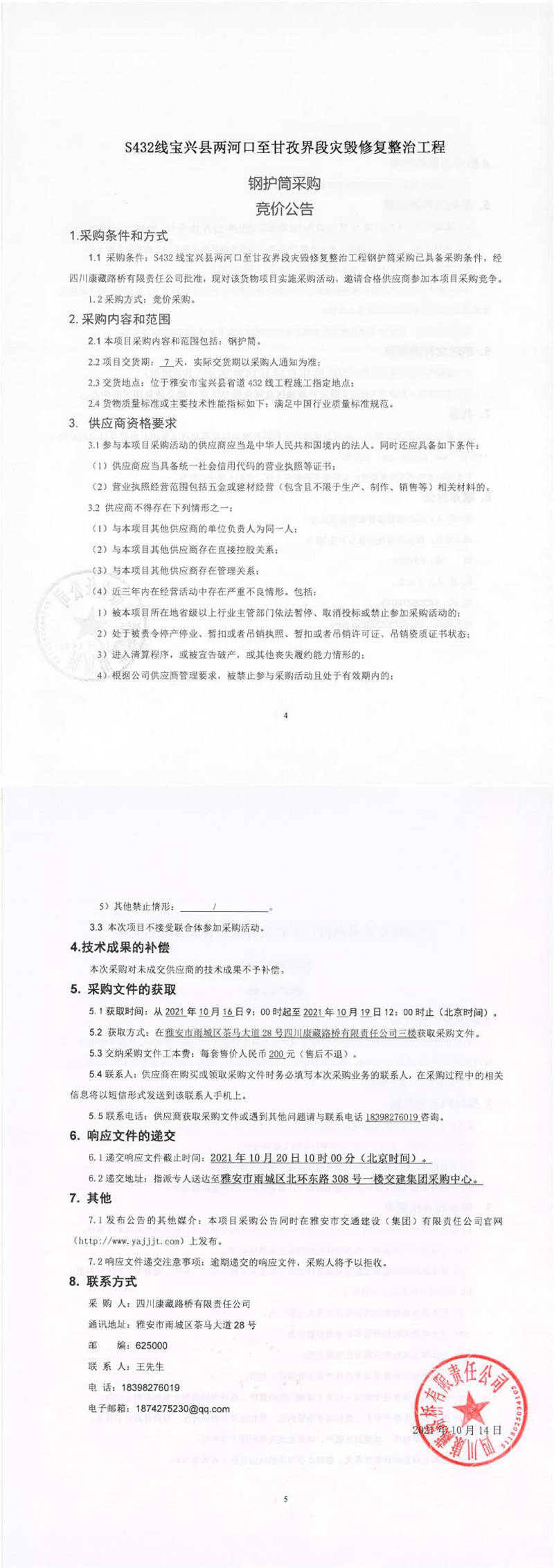 四川康藏路橋有限責任公司S432線寶興縣兩河口至甘孜界段災毀修復整治工程鋼護筒采購競價公告
