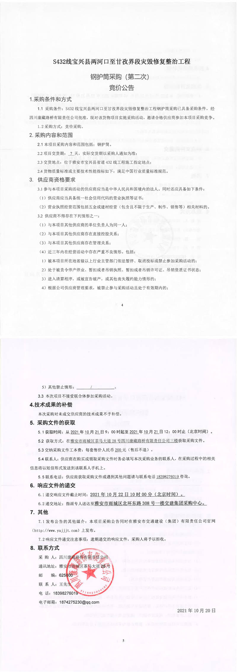 四川康藏路橋有限責(zé)任公司S432線寶興縣兩河口至甘孜界段災(zāi)毀修復(fù)整治工程鋼護(hù)筒采購(第二次)競價(jià)公告