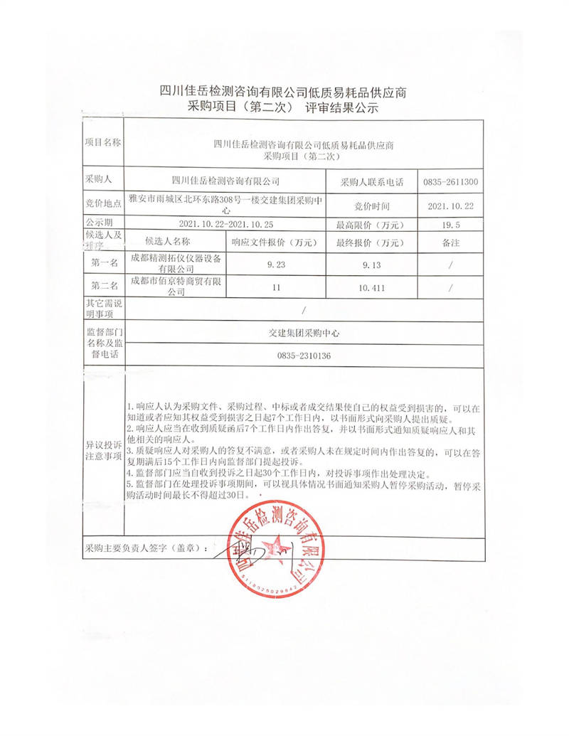 四川佳岳檢測咨詢有限公司低質(zhì)易耗品供應(yīng)商采購項(xiàng)目(第二次)評(píng)審結(jié)果公示